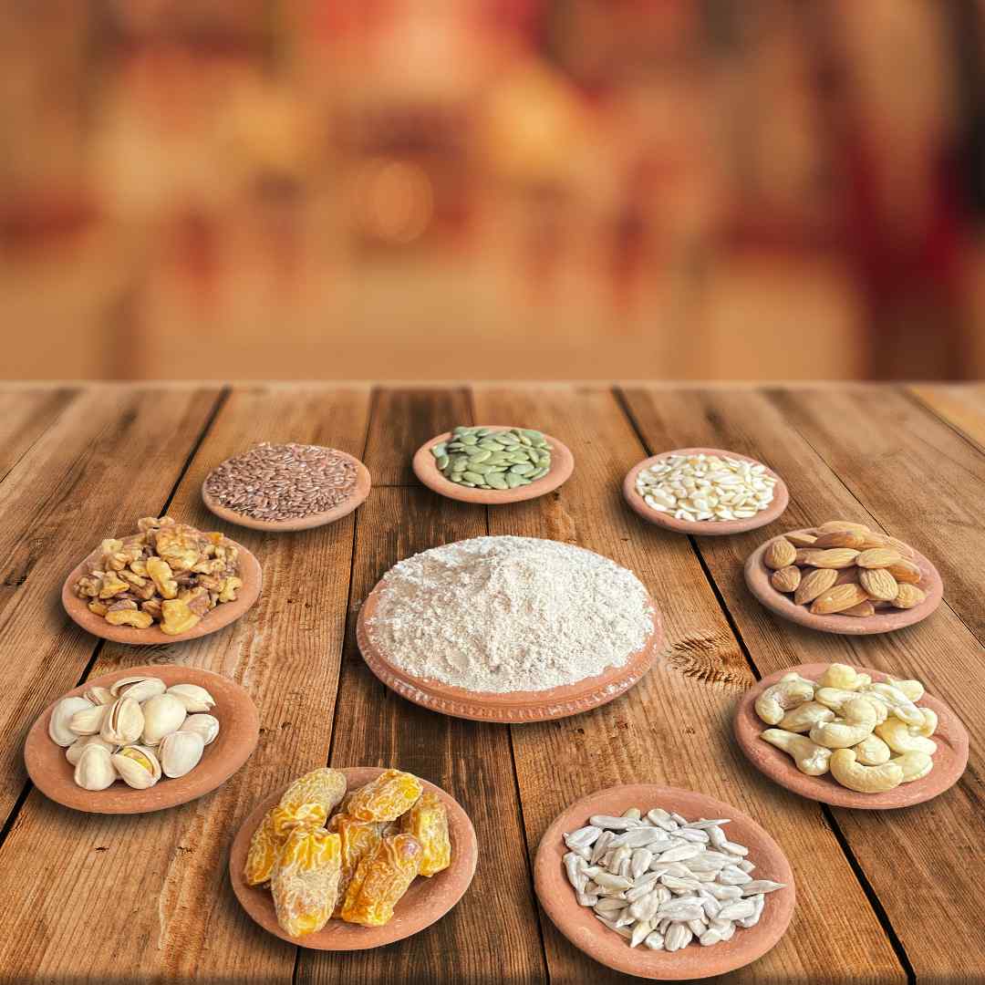 Our Dry fruit mix Malt include, almonds, pista, cashews, dates, walnuts, watermelon seeds, lotus seeds/makhana, pumpkin seeds with some high protein & minerals ingredients like rajma, masoor, moong, soya etc